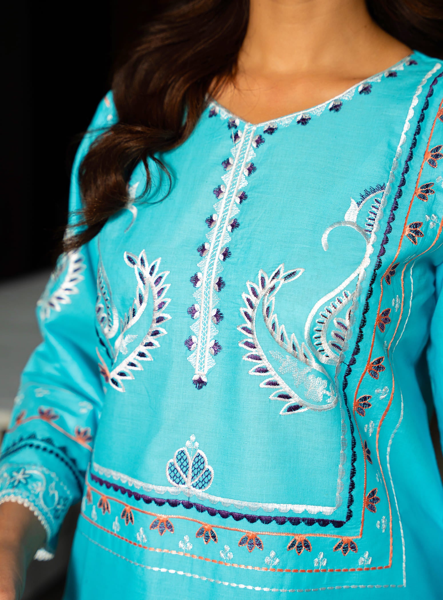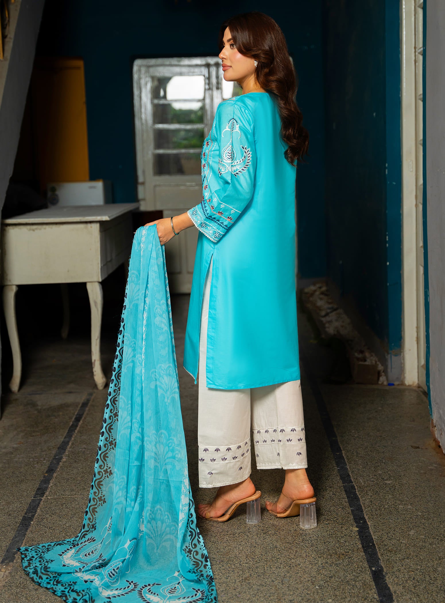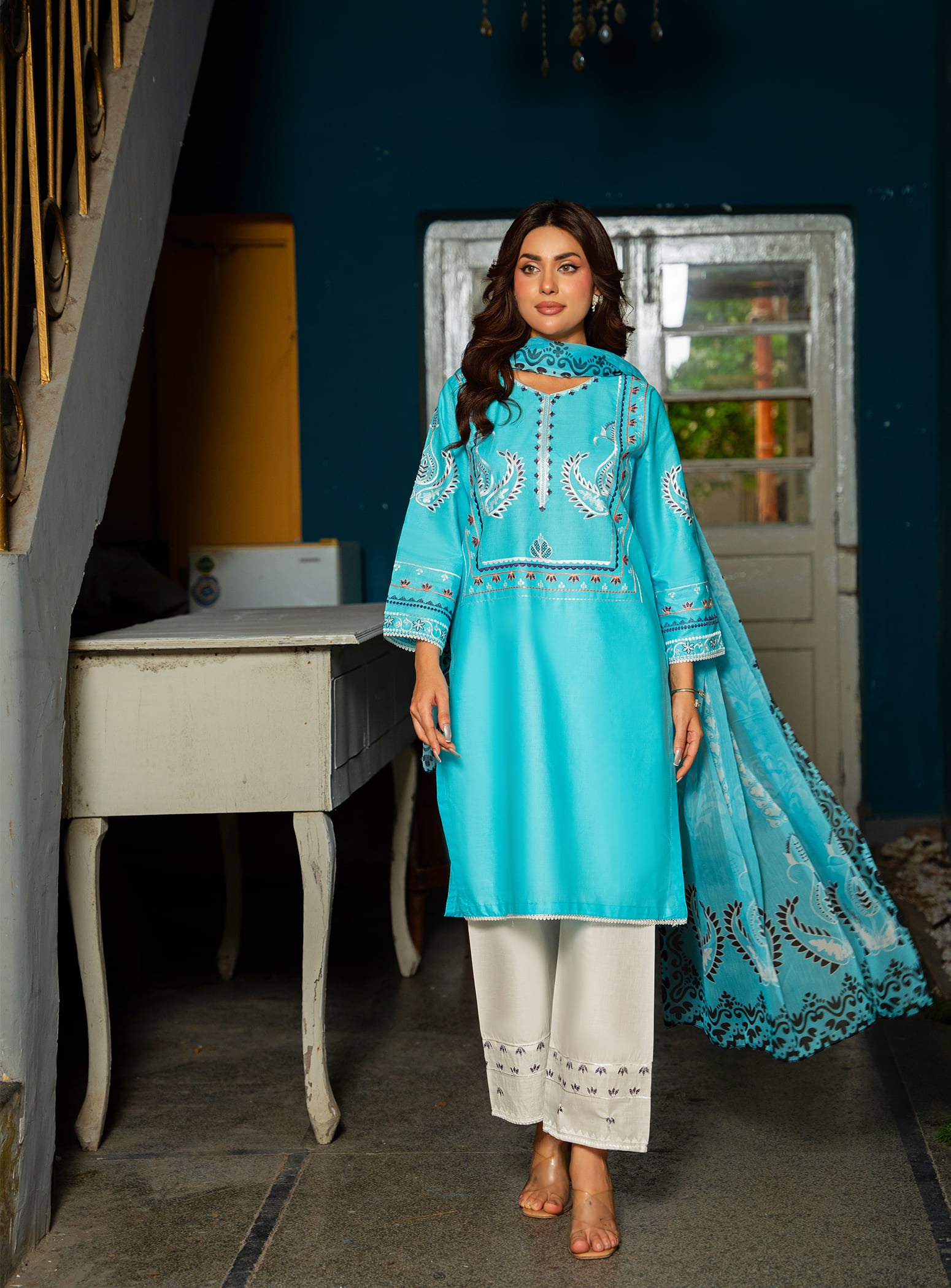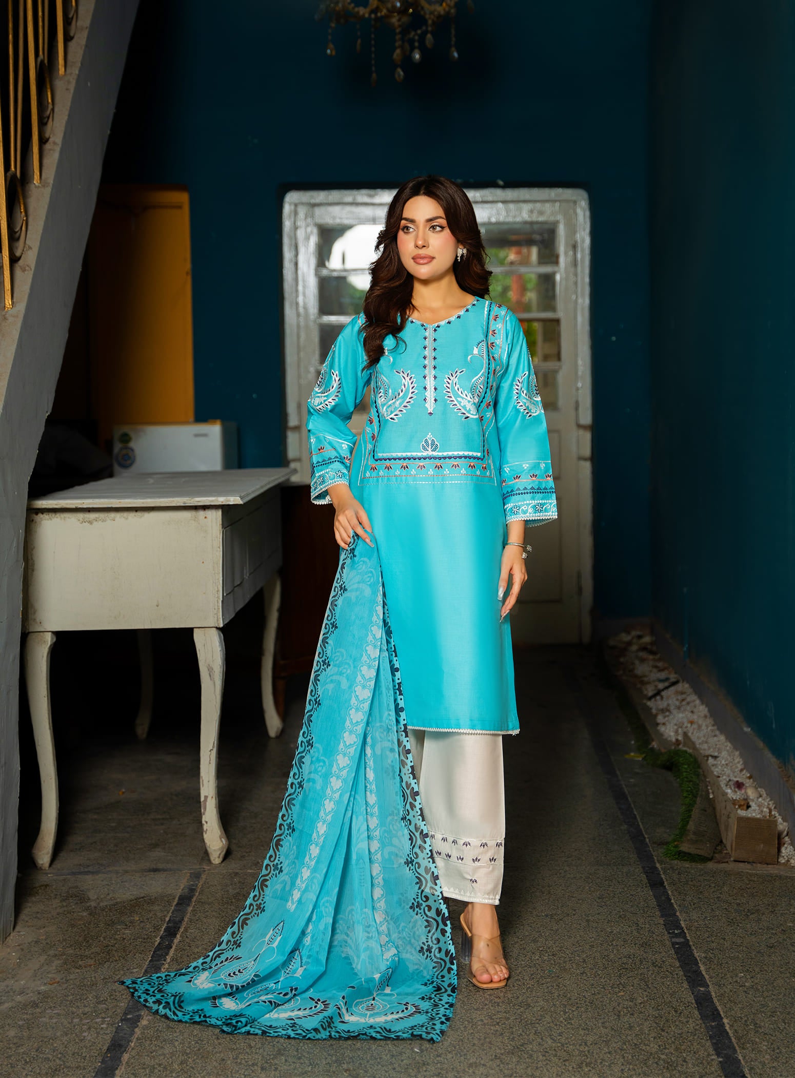 Made from breathable cotton fabric, this aquamarine ensemble features a beautifully embroidered straight cut kurta with a matching straight trouser. The look is completed with a stunning digital printed dupatta, adding a vibrant yet graceful touch – making it a perfect choice for summer wear.